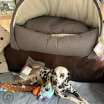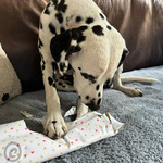Vrijdag vierde Dalina haar 4e verjaardag. Ze heeft een bijzonder jaar achter de rug; een jaar waarin ze moeder werd en zo ontzettend goed gemoederd heeft. Ze genoot van elke fase van de pups, van voeden, verzorgen en het spelen met ze. Ze is heel blij dat Philos bij ons blijft. We hebben haar verjaardag uiteraard gevierd met taart en cadeautjes .